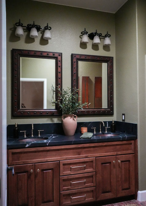 Sometimes a refresh is all you need. Talk about a small-scale renovation with a big impact, Casa del Mechals refresh celebrates refined simplicity and thoughtful updates. In the kitchen, new countertops and a custom backsplash set the tone for a modernized, elevated feel. A stunning copper sink and a custom plaster travertino hood create a warm, artisanal focal point, while select cabinetry was reworked to accommodate upgraded appliances. The design is tied together with a statement pendant and new hardware, adding cohesion and depth. The guest bath received a fresh transformation as well, featuring a new vanity, shower glass, and updated fixtures—bringing a cohesive, contemporary warmth throughout the home.
